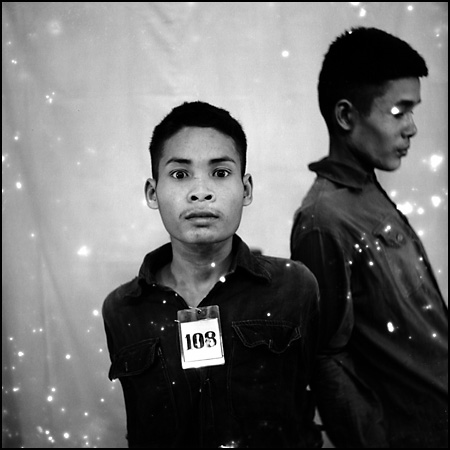 Two unidentified Cambodian men, tied together at their elbows, in one of the 7,000 remaining photographs from S-21 prison. Altogether nearly 30,000 people were imprisoned at S-21 and later killed, during Pol Pot's brutal four years in power. This photograph, as well as many others, were damaged by mold and insects, in the years since 1975-8 when the prison operated. Photo: © Tuol Sleng Museum of Genocide |